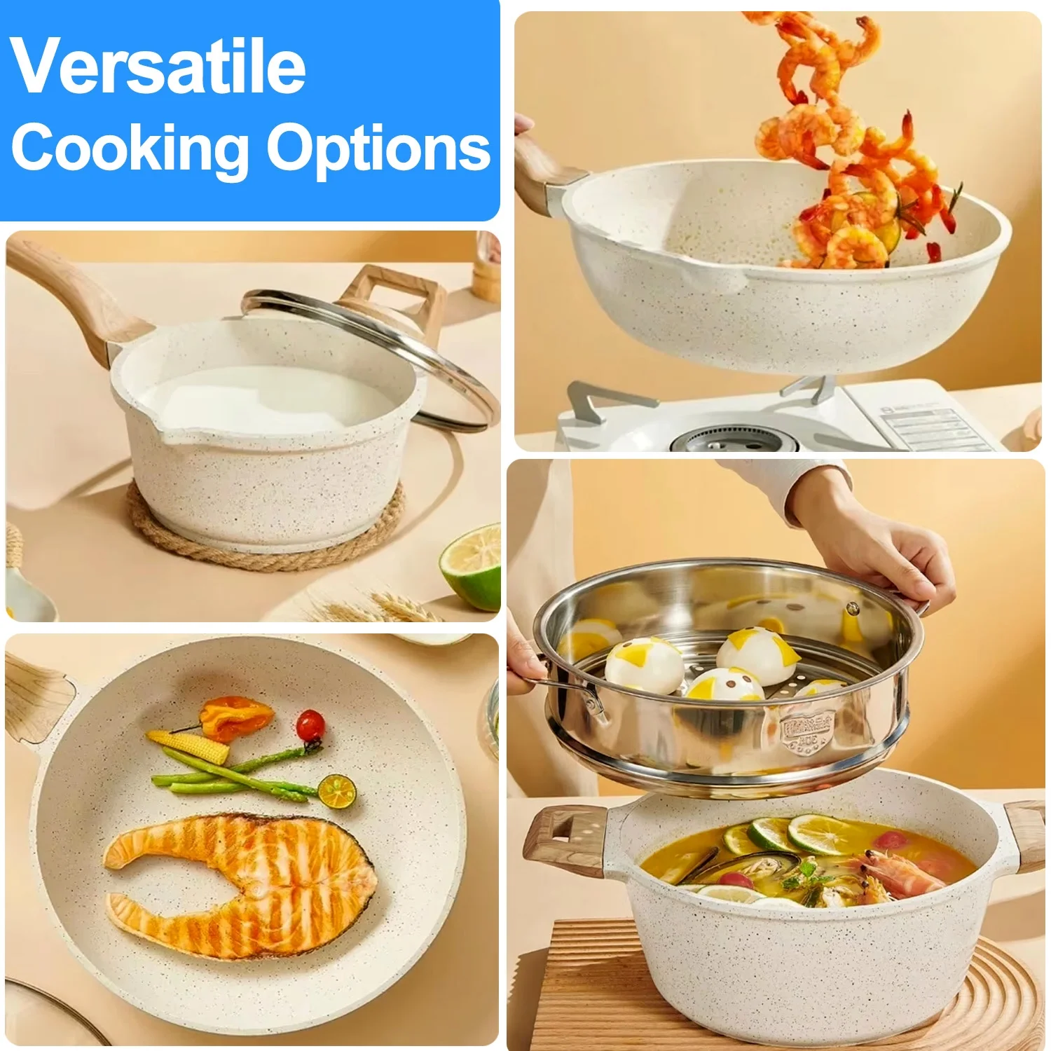 Upgrade your kitchen with this 19-Piece Nonstick Pots and Pans Cookware Set, designed for convenience, durability, and modern cooking needs. The premium nonstick surface ensures food releases easily and requires less oil or butter, promoting healthier meals and effortless cleanup. Constructed with high-quality materials, the cookware provides even heat distribution across all surfaces, preventing hotspots and ensuring perfectly cooked meals every time. The induction-compatible stainless steel base works seamlessly on all stovetops, including induction, gas, electric, and ceramic hobs. For safe and comfortable handling, each pot and pan is equipped with sturdy Bakelite handles, preventing scalding and making cooking safer. Transparent lids allow you to monitor your food without lifting the cover, helping retain heat and flavor while cooking. This set is designed for easy maintenance, with dishwasher-safe properties and a nonstick surface that wipes clean in seconds. Manufactured under strict quality control standards, this cookware set undergoes rigorous testing to guarantee durability, performance, and long-lasting reliability. Perfect for home kitchens, this 19-piece cookware collection combines functionality, safety, and style, making cooking and cleanup a breeze.