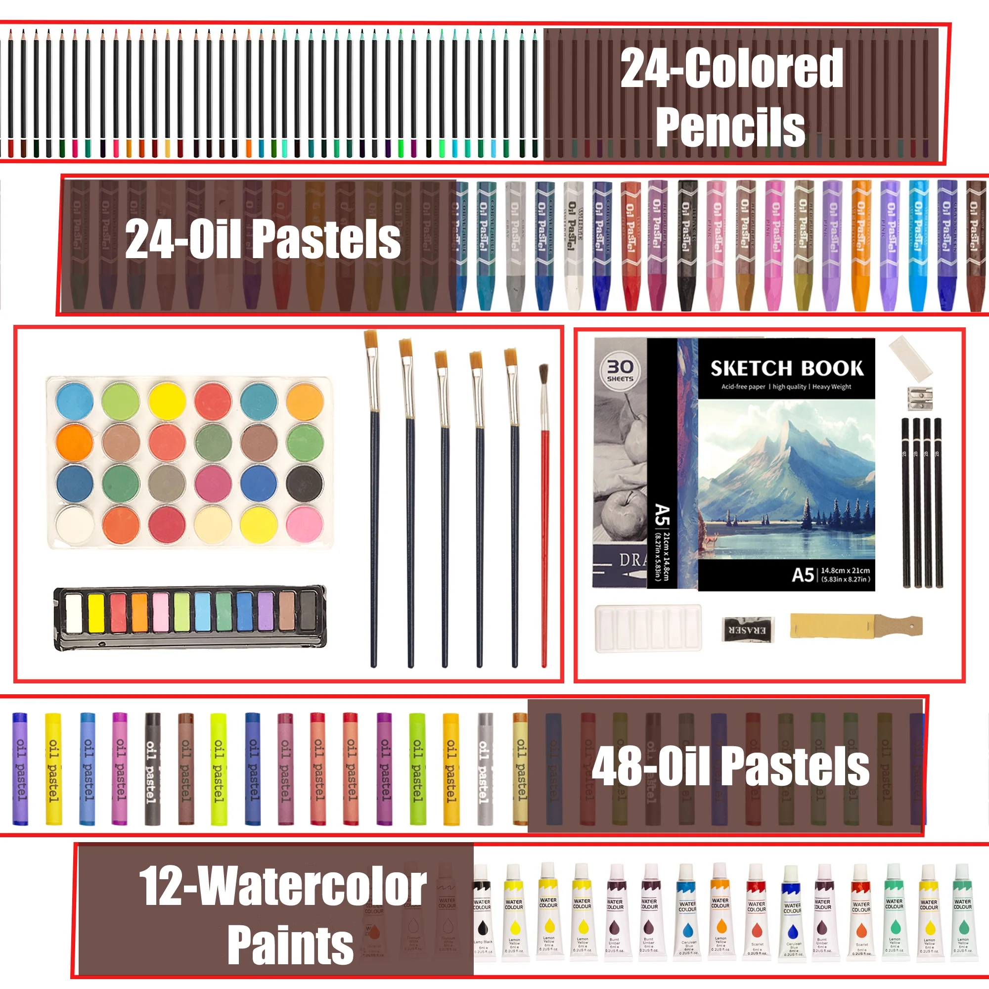 • ★【The Ultimate Art Kit】This art kit is a dream come true for budding and professional artists alike. With 48 crayons, 24 color pencils, 24 oil pastels, 24 round watercolor cakes, 12 square watercolor cakes, 12 watercolor paints, 6 brushes, 4 HB pencil, 4 2B pencil, 3 drawing pads, 2 eraser, 1 sandpaper block, 1 sharpener, 1 palette, 1 ruler, 1 coloring pad, this set has everything you need to create beautiful art. All of the supplies are neatly organized in a gorgeous wooden case, making it the perfect gift for kids, teenagers, and anyone who loves art.