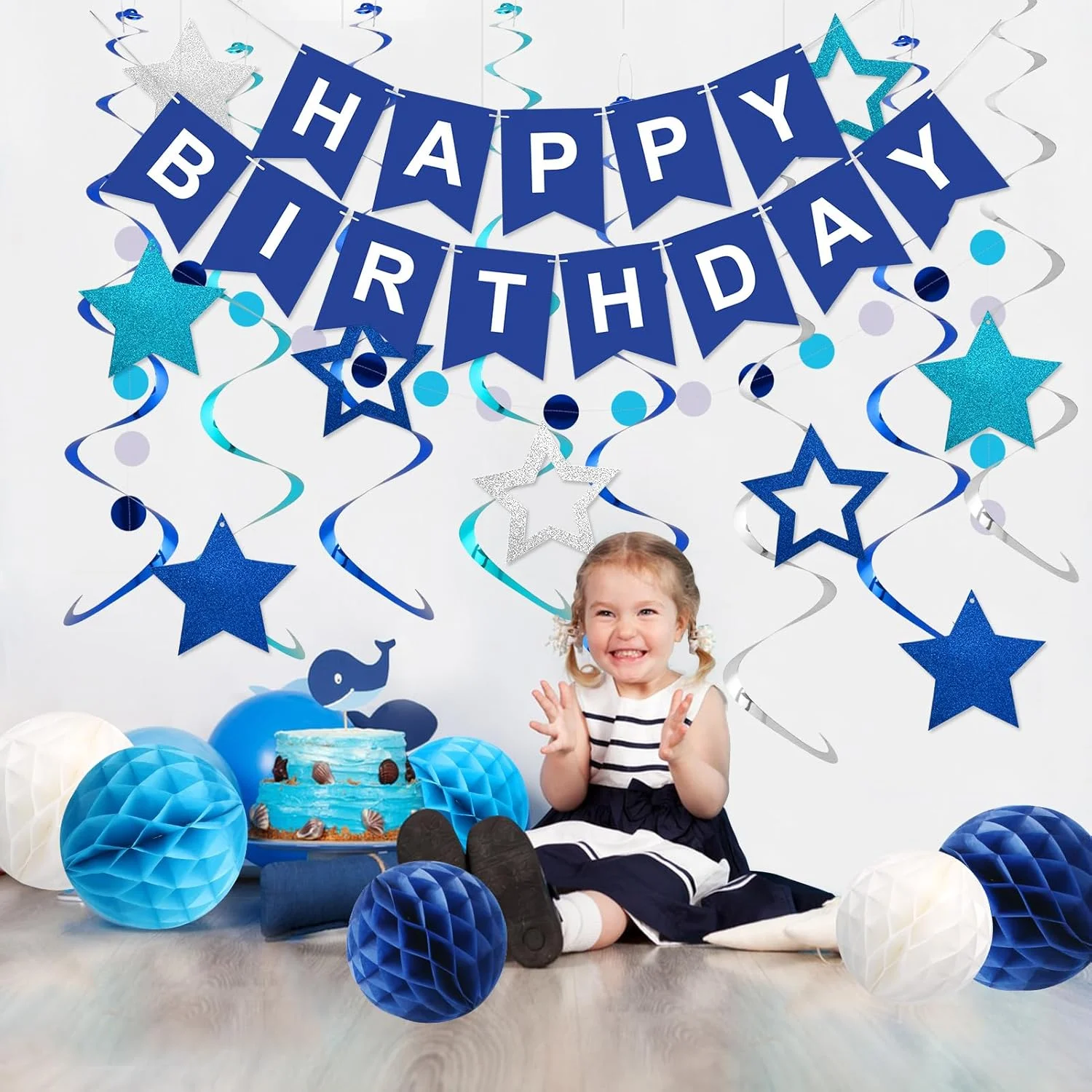 Birthday Decorations, Happy Birthday Banner with Balls, Stars, Circle Dots, Happy Birthday Party Decorations for Women Men Boys Girls (Blue)