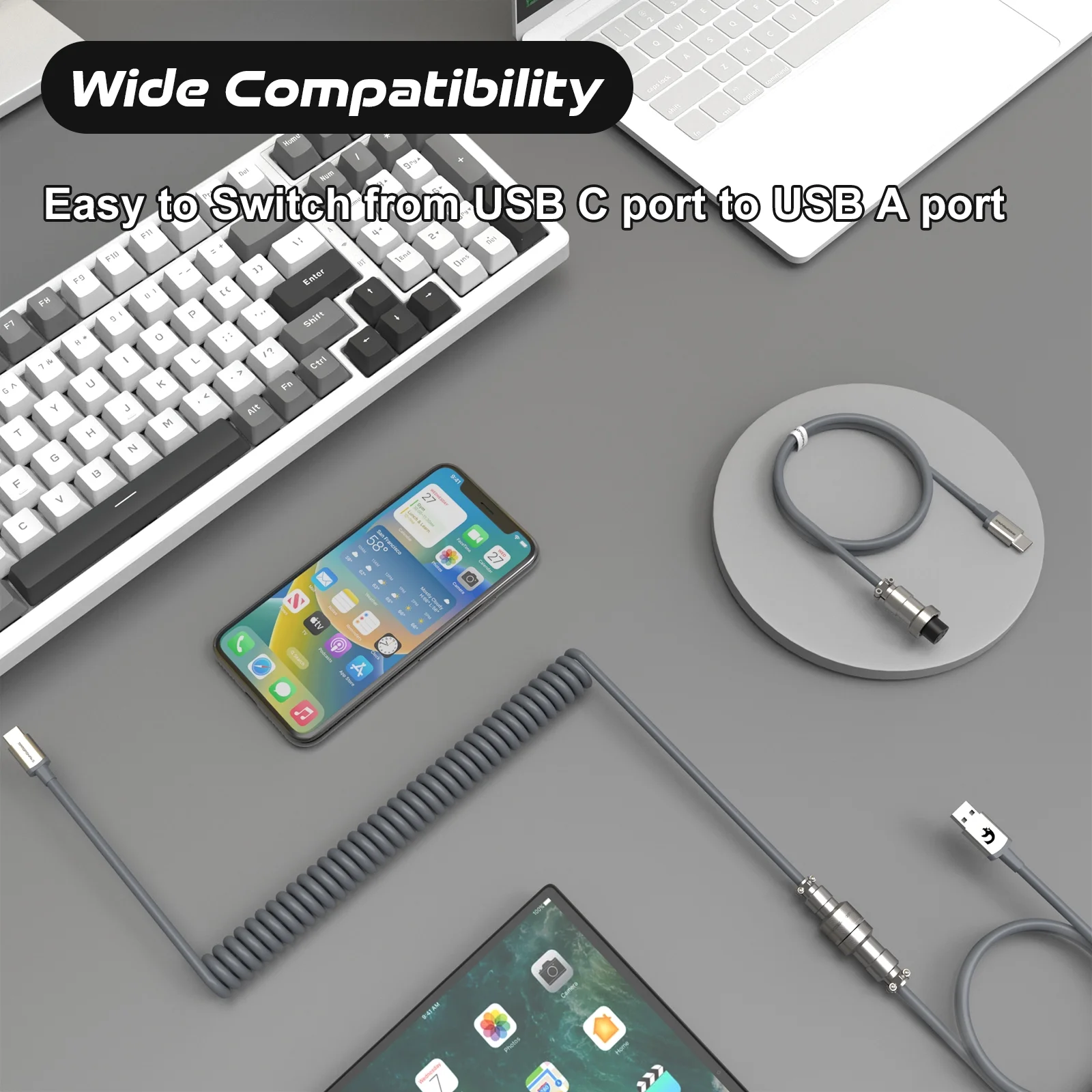 A premium double-sleeved coiled USB-C cable featuring a detachable metal aviator connector, perfect for custom and gaming keyboards. Durable, stylish, and designed to keep your setup clean and high-performing.