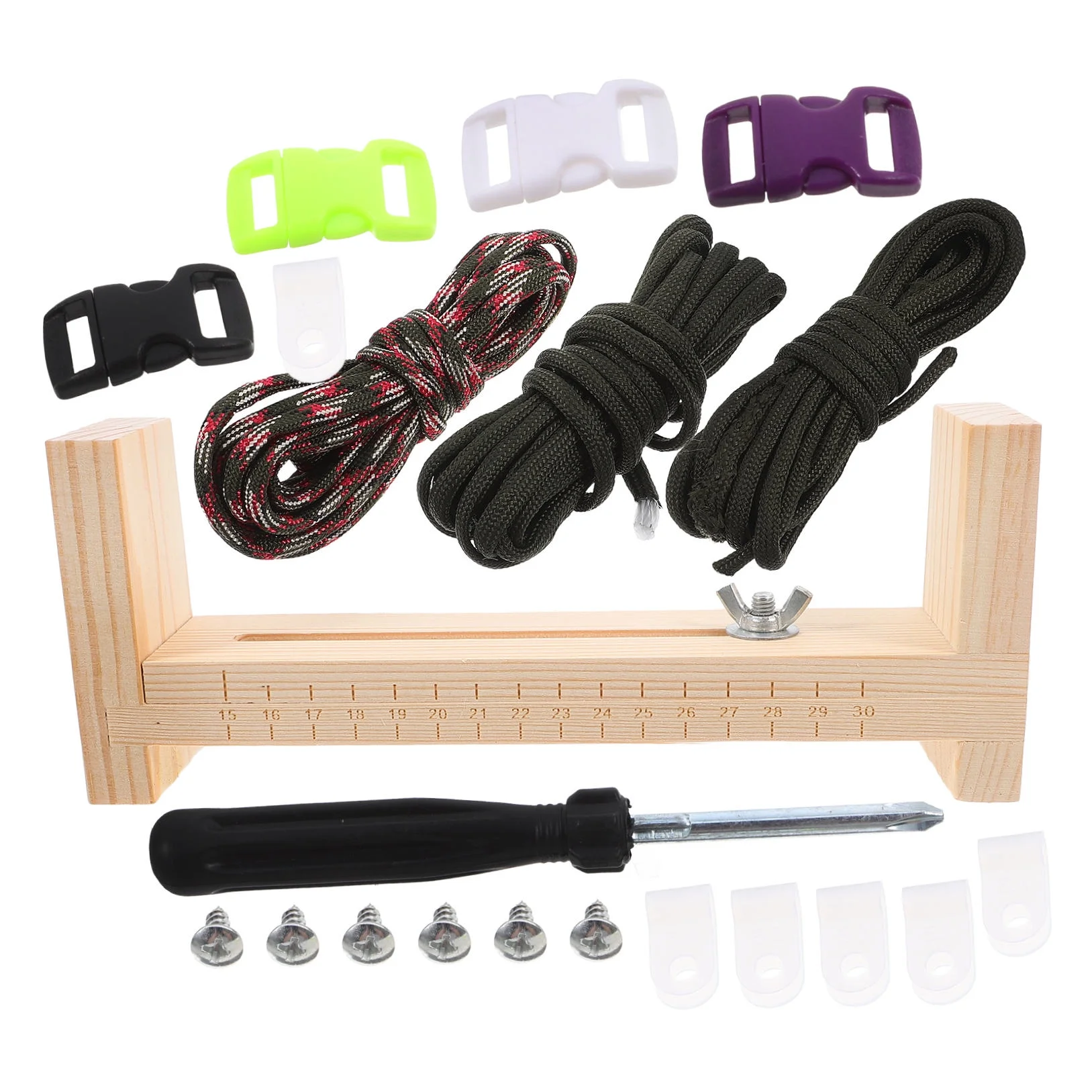 • 4 x Plastic Buckles (Random Colors) 1 x Wooden Frame 3 Rolls x Ropes (Random Colors)-lanyard string kit