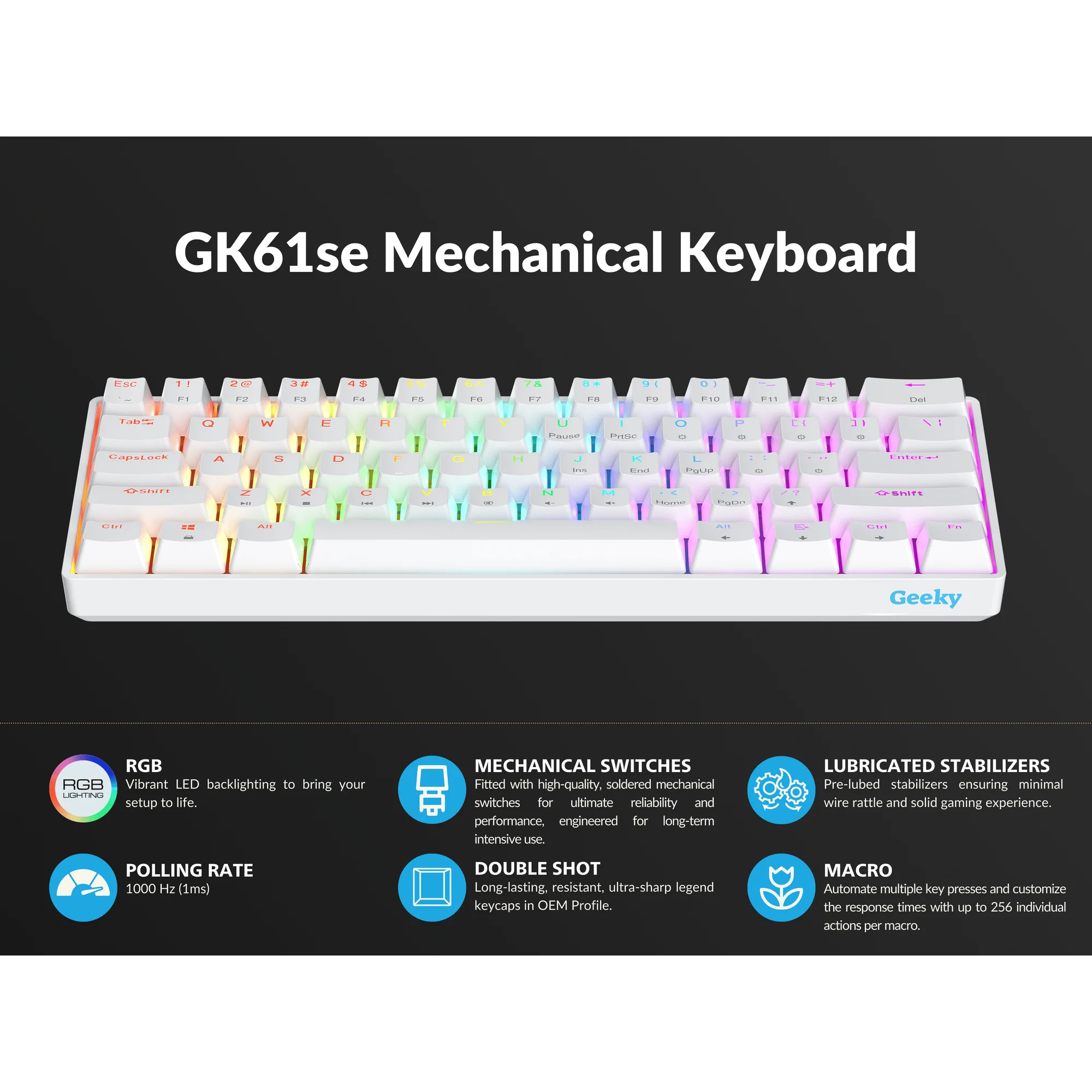 • Compact Design: The Geeky GK61 SE features a 60% layout with 61 keys, making it compact and space-saving