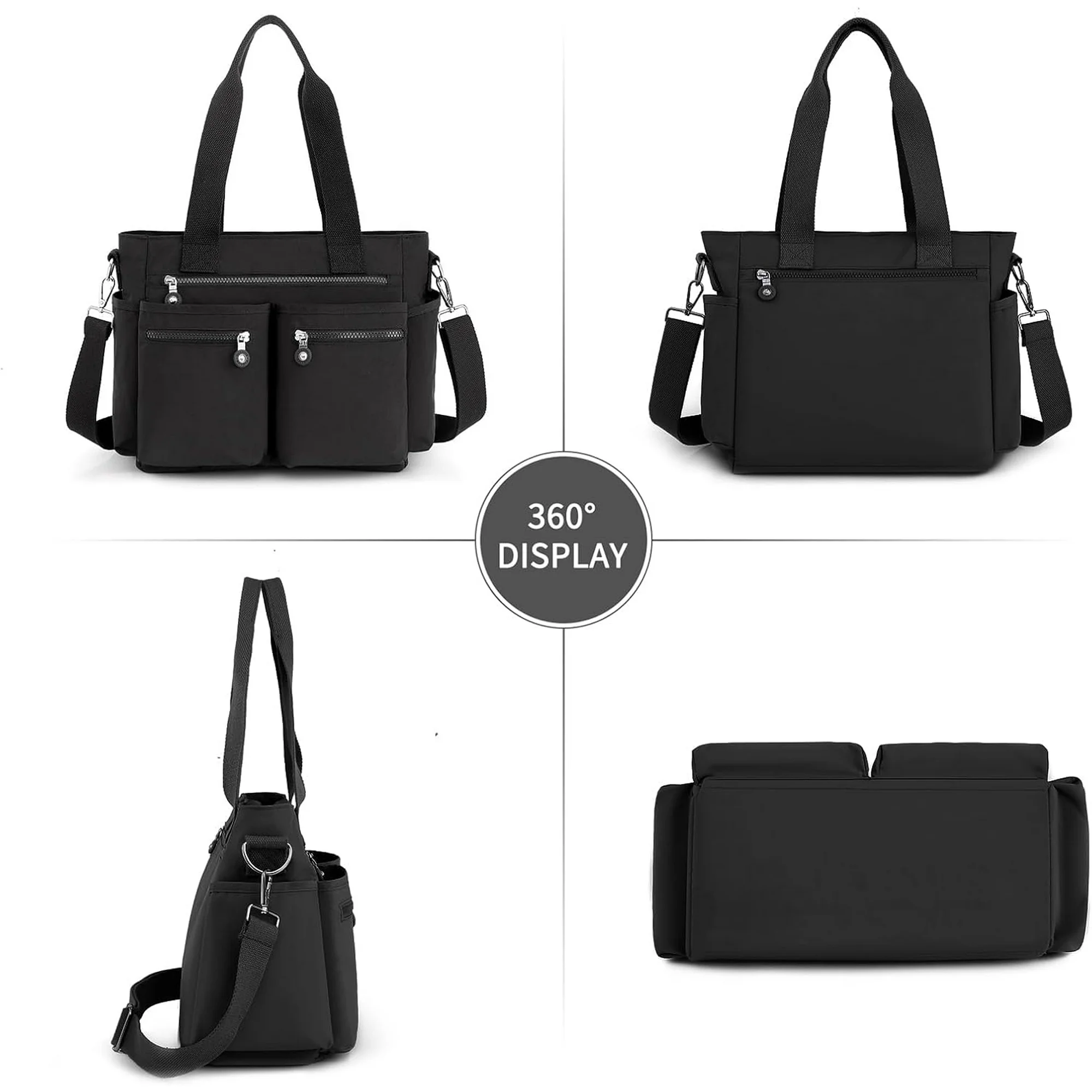 Gocvo Casual Tote Bags with Multiple Pockets, Nylon Large Capacity Crossbody Tote Bag, Working Bag for Ladies (Black)