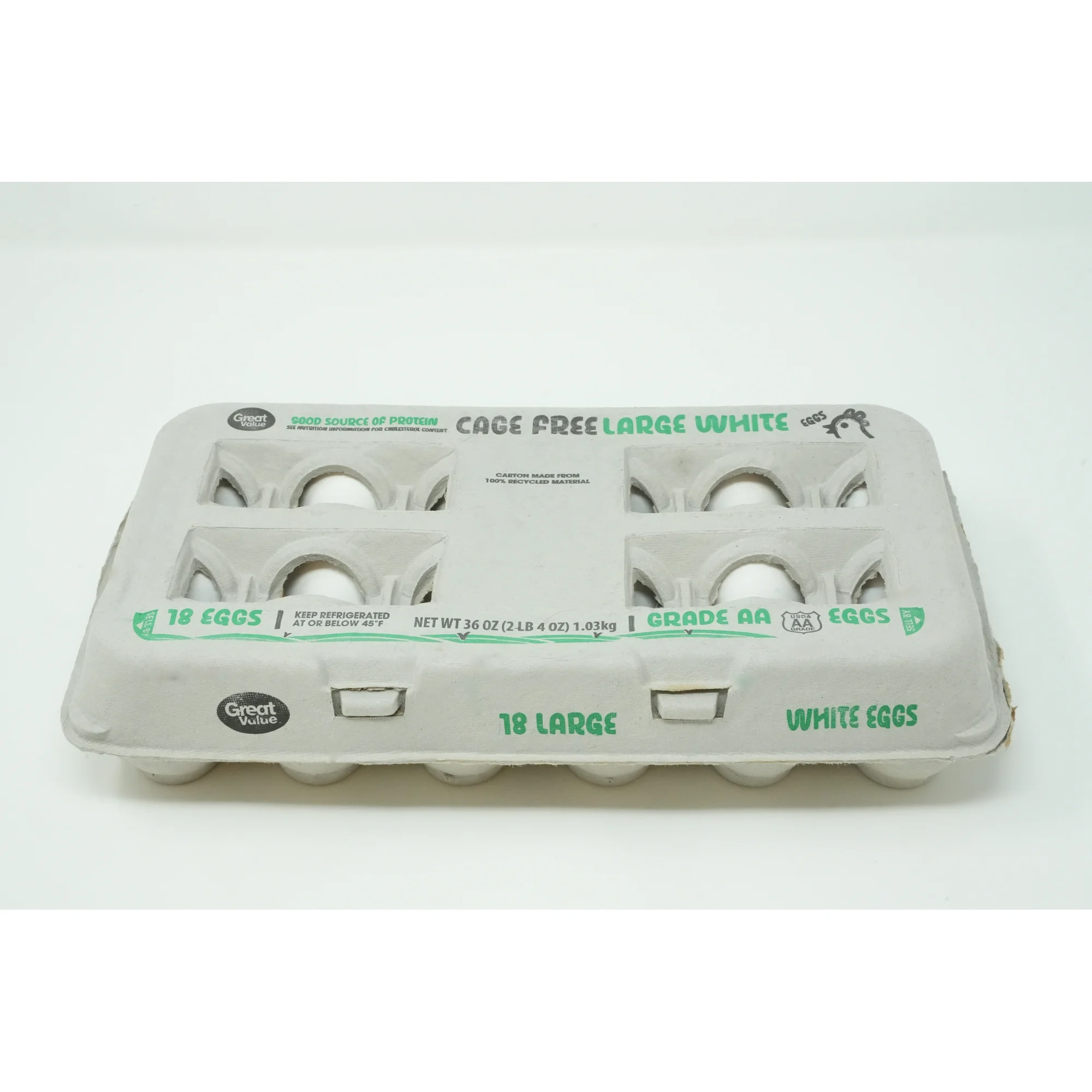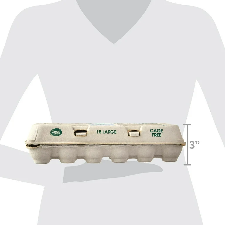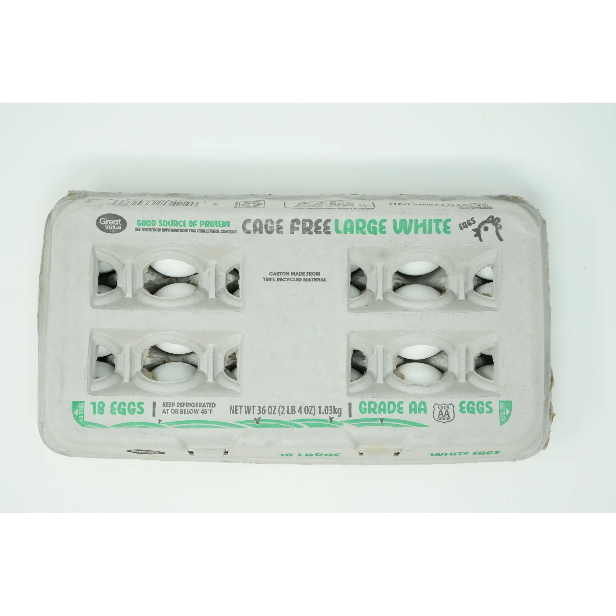 Bring wholesome nutrition to your table with Great Value Cage-Free Large White Eggs. Sourced from cage-free hens, these eggs provide rich flavor and high-quality protein for a variety of meals. Perfect for breakfast, baking, or adding to your favorite recipes, they offer a versatile and reliable ingredient for every kitchen. This 18-count carton ensures your family has enough eggs to meet everyday needs, from simple scrambled eggs to elaborate recipes. With their fresh taste, superior quality, and nutritional benefits, Great Value Cage-Free White Eggs are a smart and convenient choice for households seeking healthy, reliable eggs.