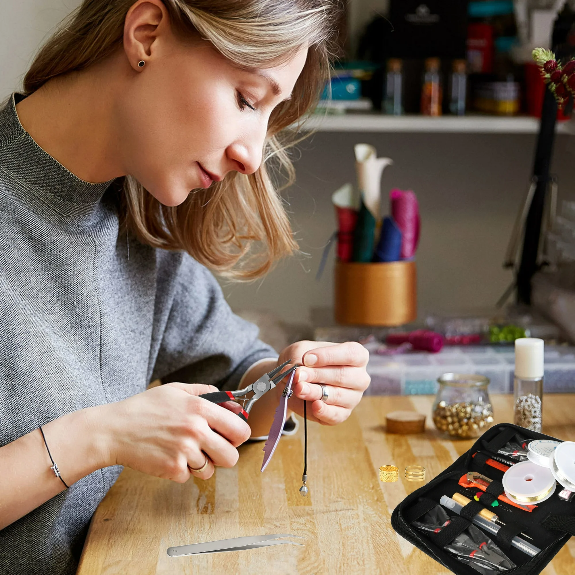 Complete Package: Includes pliers, beading cords/wires, tweezers, caliper, awl, jump ring opener, thimble ring, scissors, tape measure, needle threaders, and beading needles.