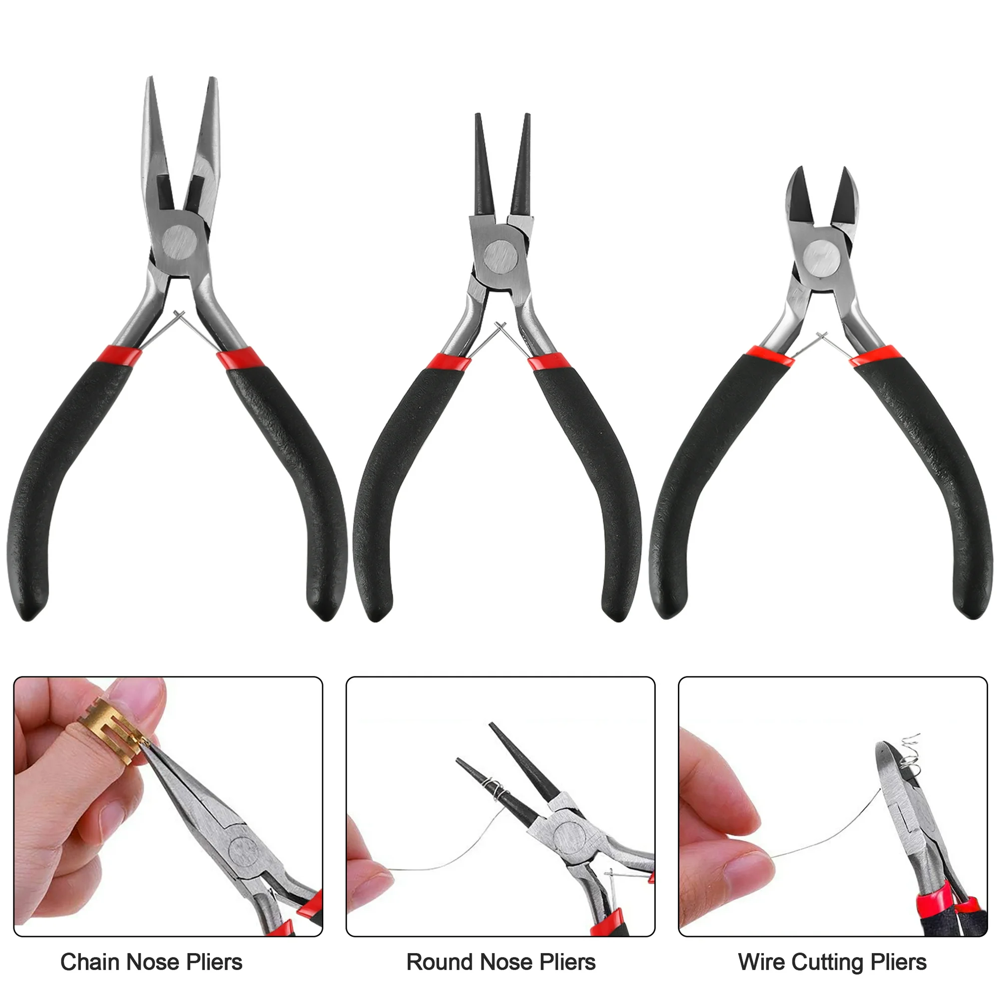 Essential Tools: Round nose, wire cutting, and chain nose pliers with non-slip handles.