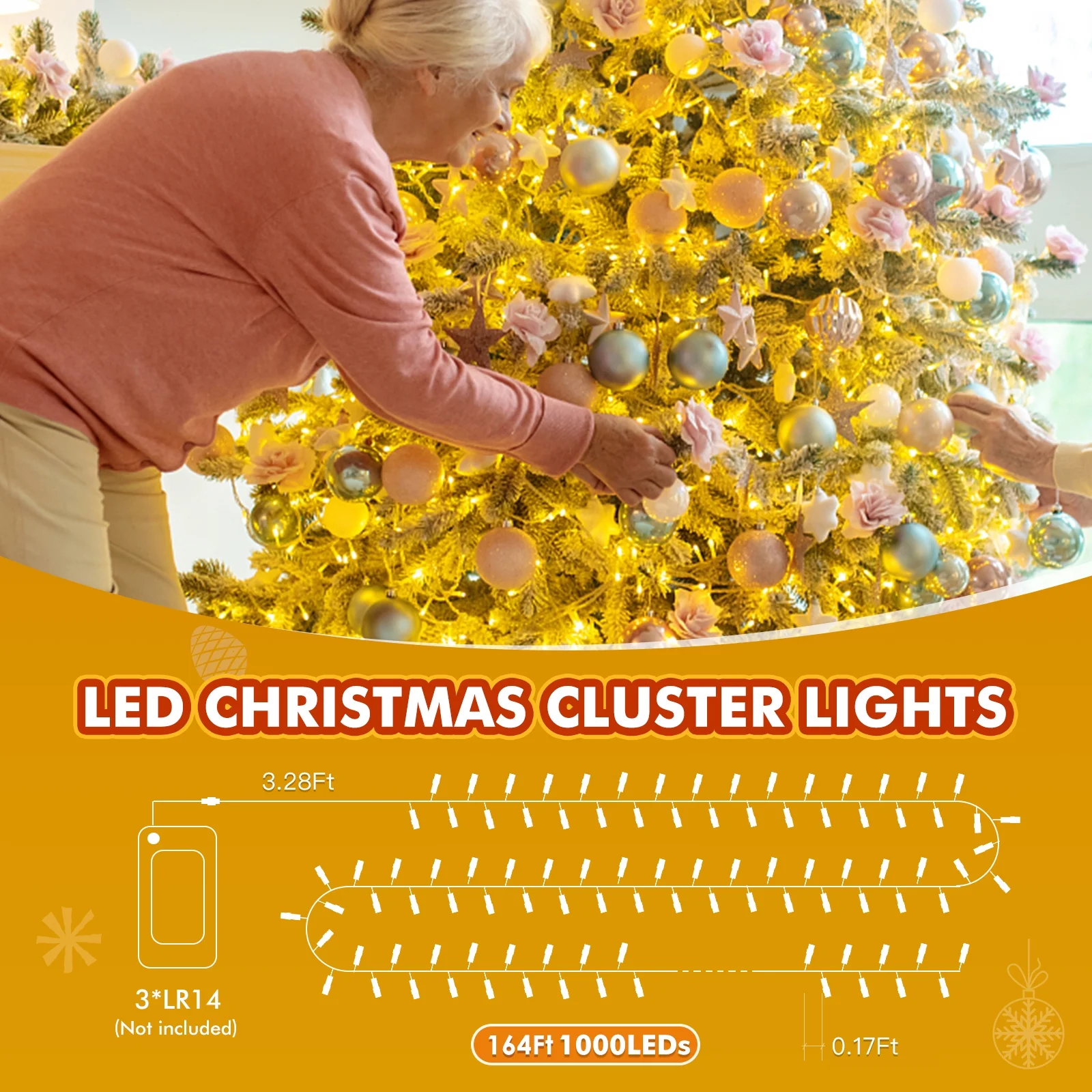 • ✨ Warm White LED Christmas Tree Lights – 1000 battery-powered LEDs (50m/164ft + 1m extension) with 0.17ft spacing for a dense, stunning glow. Perfect for trees, toys, and wide-area décor.
