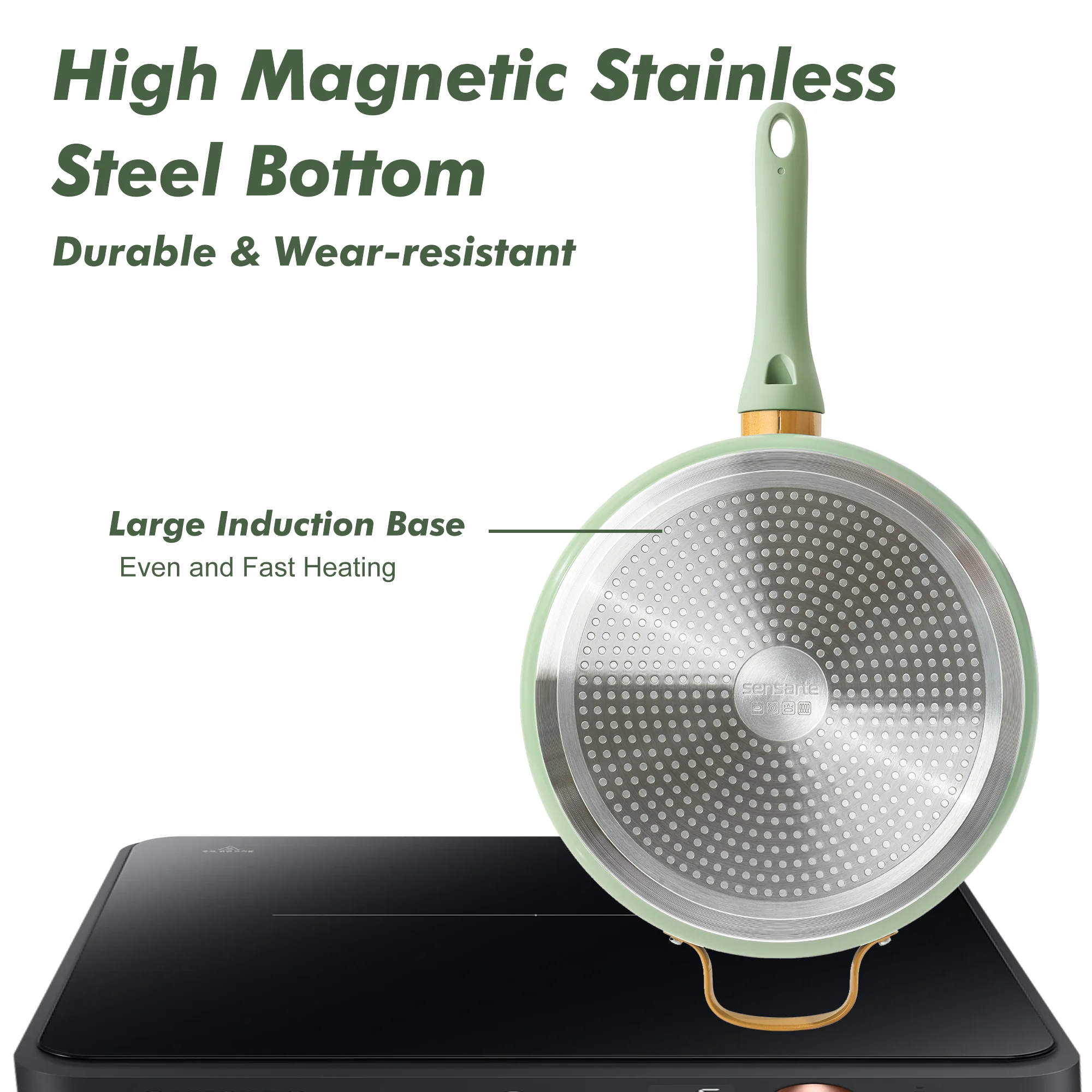 The SENSARTE 18-Piece Nonstick Cookware Set features a smooth super nonstick surface, comfortable anti-scald Bakelite handles, and a high magnetic conductive base for even heat distribution. Made from durable cast aluminum, this induction-compatible set is easy to clean and built for long-lasting performance.