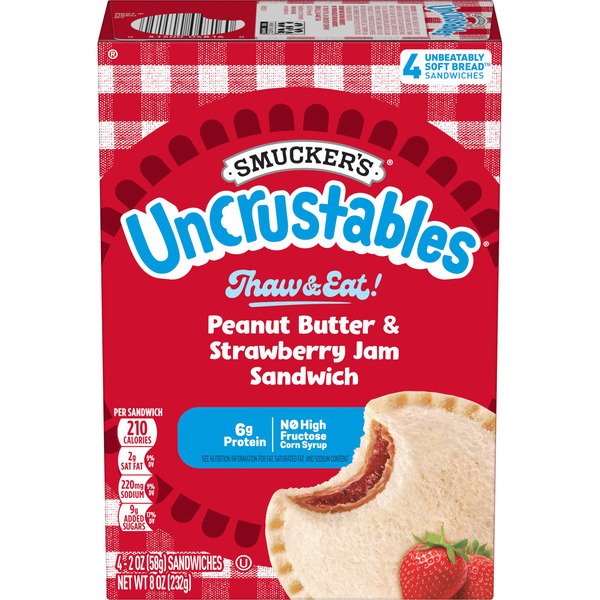 Enjoy the classic combination of creamy peanut butter and sweet strawberry jam with Smucker’s Uncrustables Peanut Butter & Strawberry Jam Sandwiches. Each sandwich is perfectly sealed without crusts, making them convenient, mess-free, and ready-to-eat straight from the freezer. This pack includes 10 individually frozen 2 oz sandwiches, making them ideal for lunchboxes, snacks, quick meals, or on-the-go treats. The soft, fresh-tasting bread and smooth, sweet filling offer a delicious and satisfying taste that both kids and adults love. Perfect for families, busy mornings, or travel, Uncrustables sandwiches are easy to store in your freezer and ready whenever hunger strikes. They’re a classic, convenient, and tasty way to enjoy the timeless peanut butter and jelly combination without the hassle of preparation.