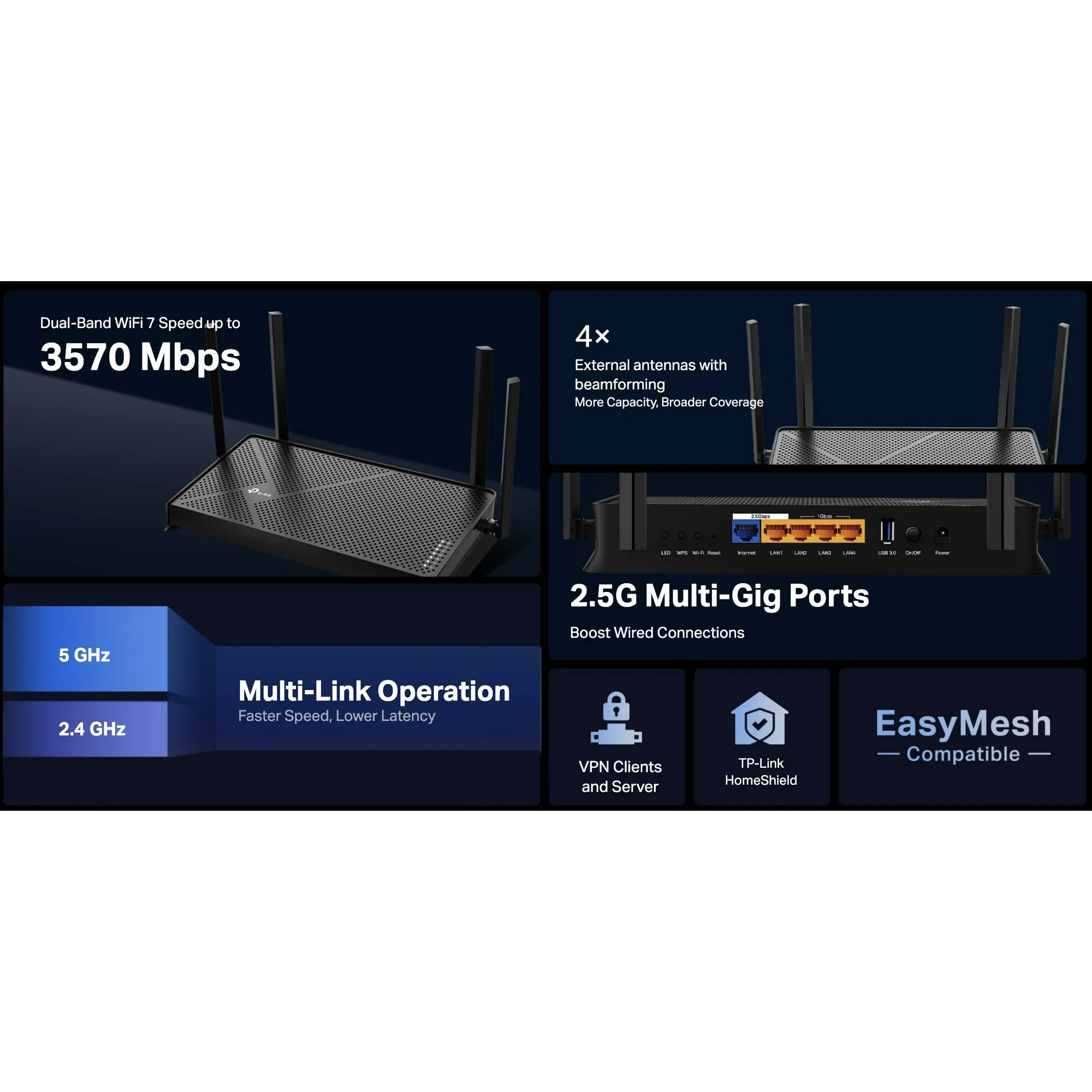 TP-Link Archer BE3600 Dual-Band WiFi 7 Router – BE3600 Speed, Dual 2.5Gbps Ports, USB 3.0, HomeShield & Parental Controls