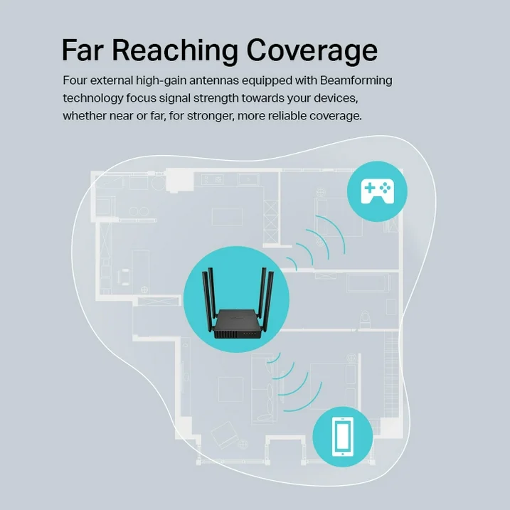 Strong, Reliable Coverage: Four antennas with Beamforming focus a stronger signal toward connected devices.