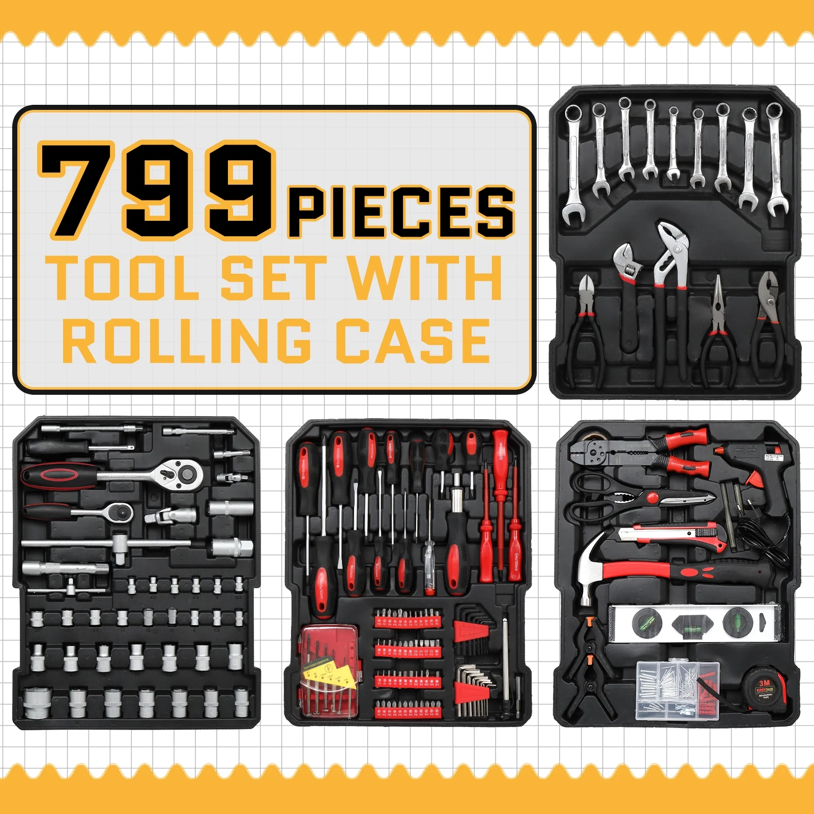 A complete 799-piece professional tool kit designed for home repairs, DIY projects, and mechanical work. Includes high-quality tools organized in a durable, wheeled trolley case. Strong, long-lasting, and easy to carry—perfect for homeowners, technicians, and hobbyists.