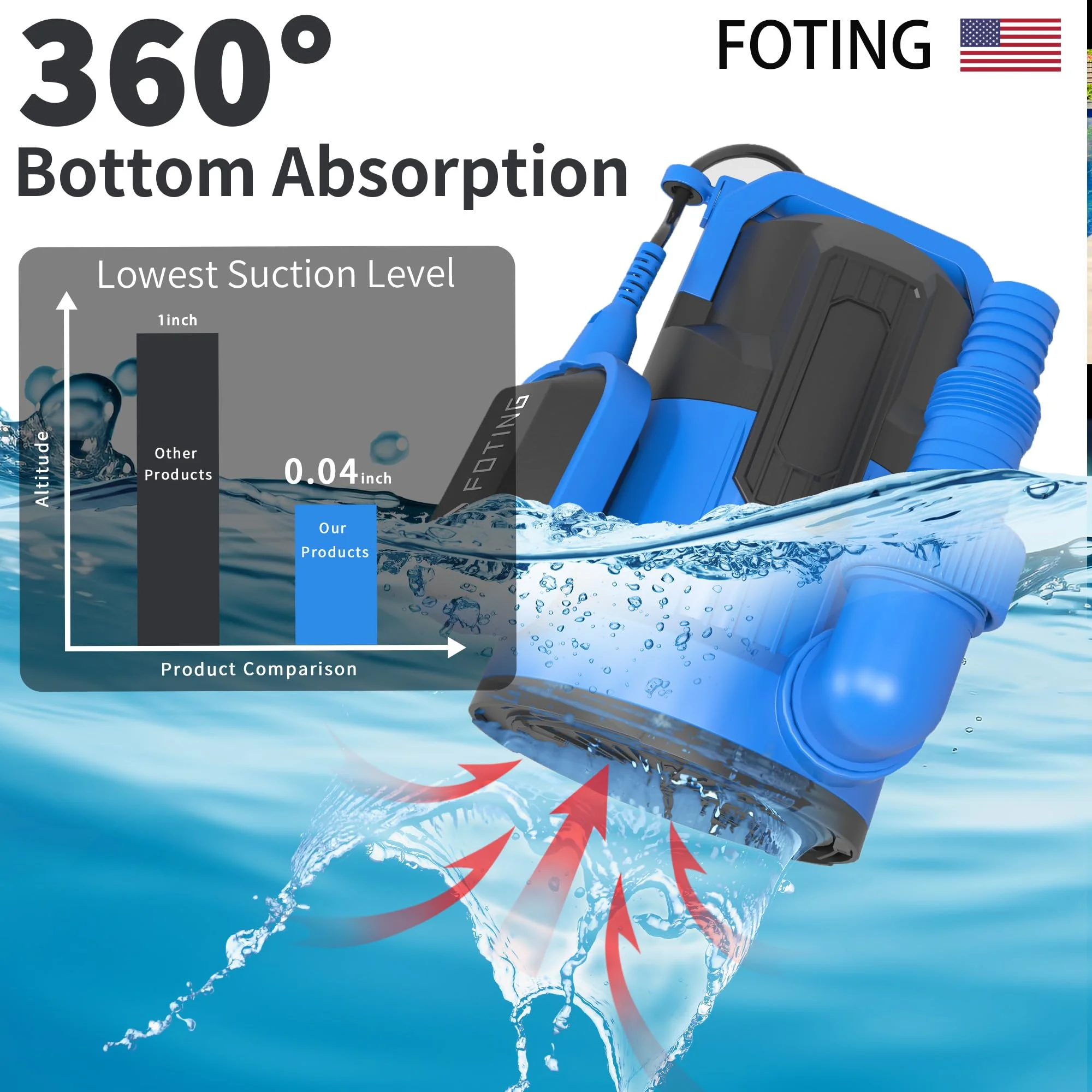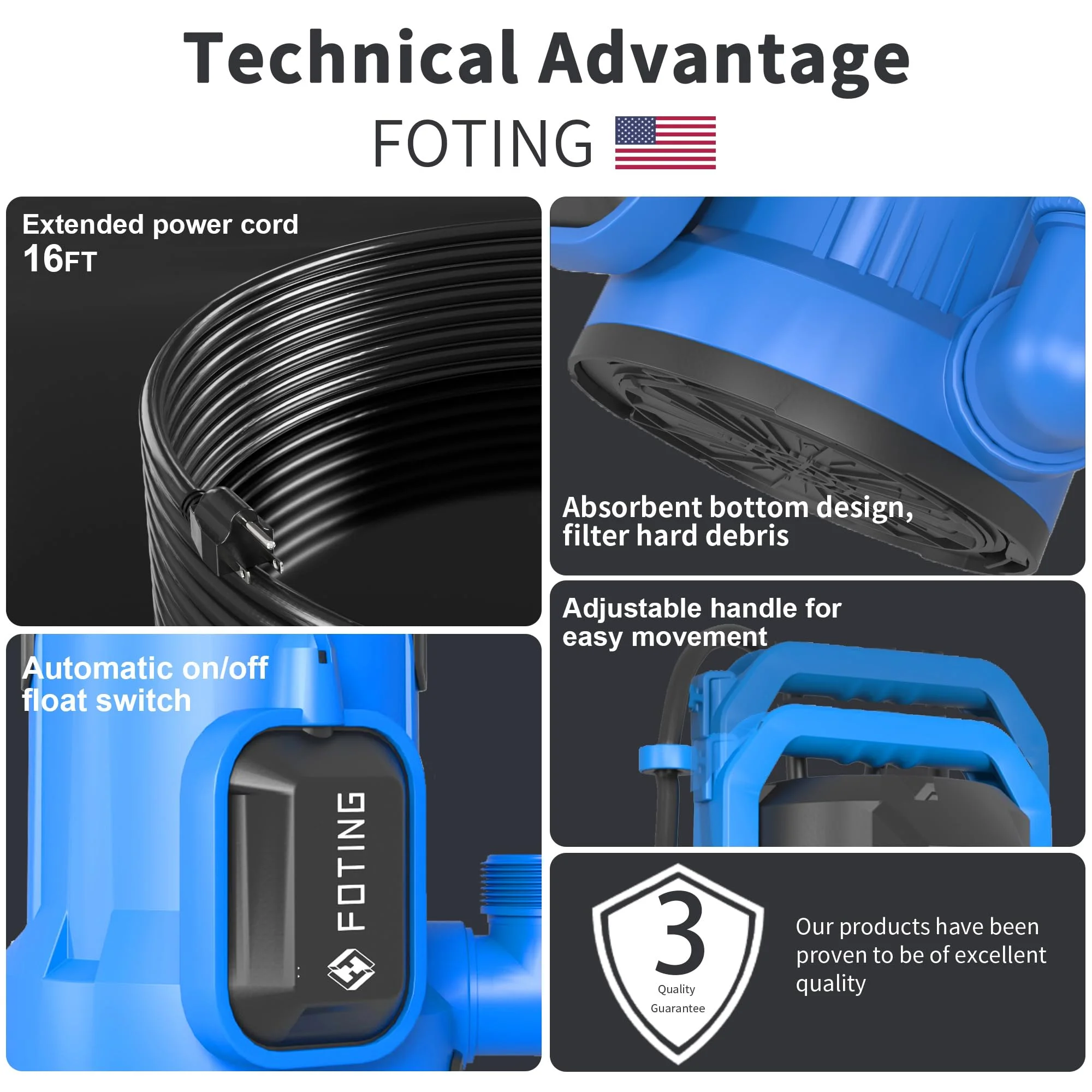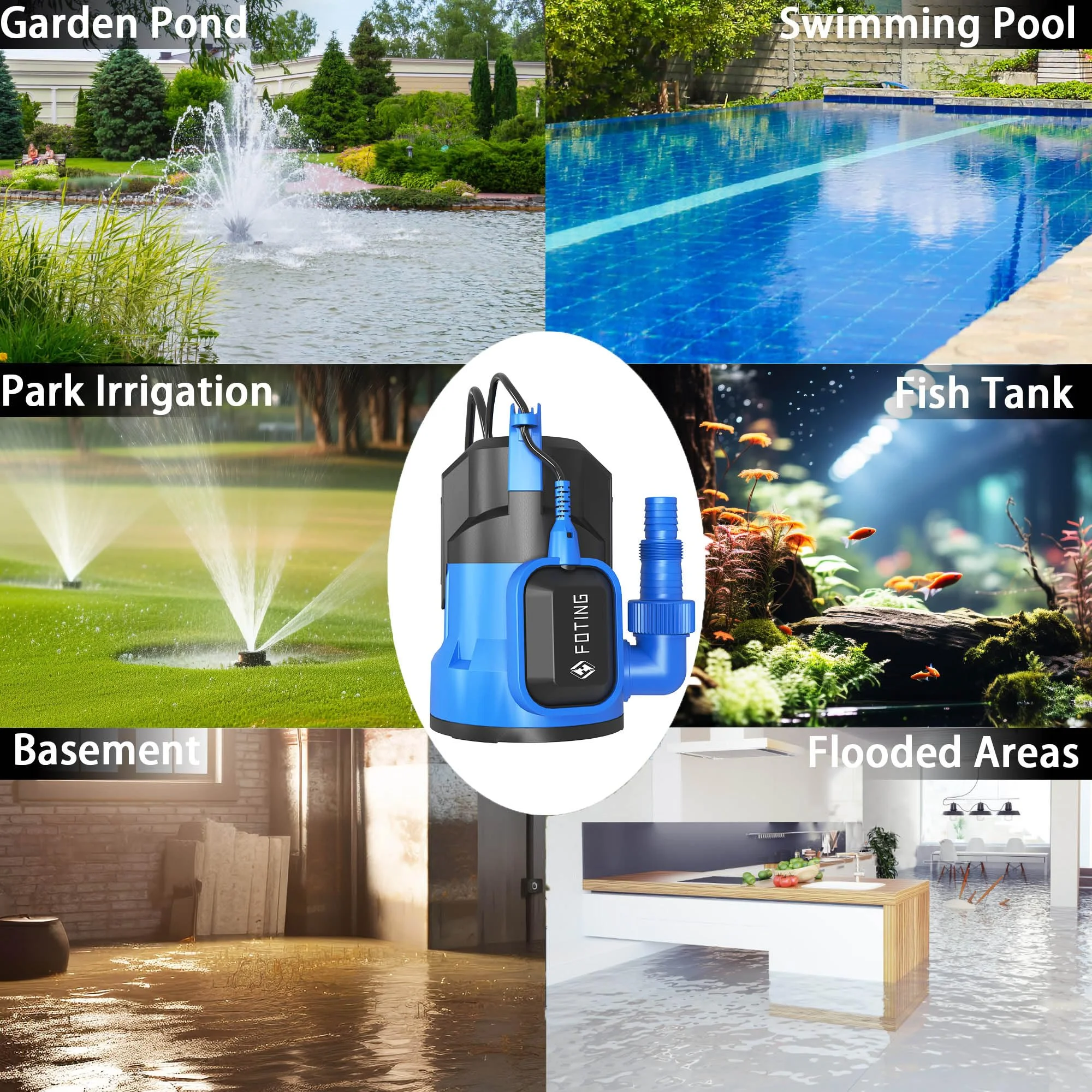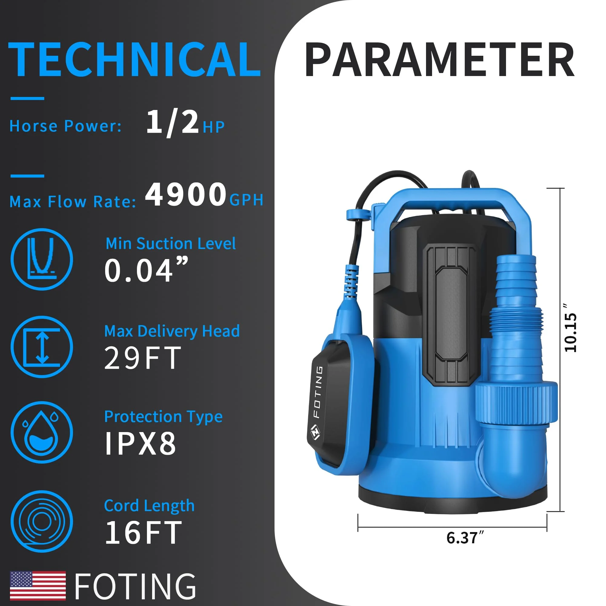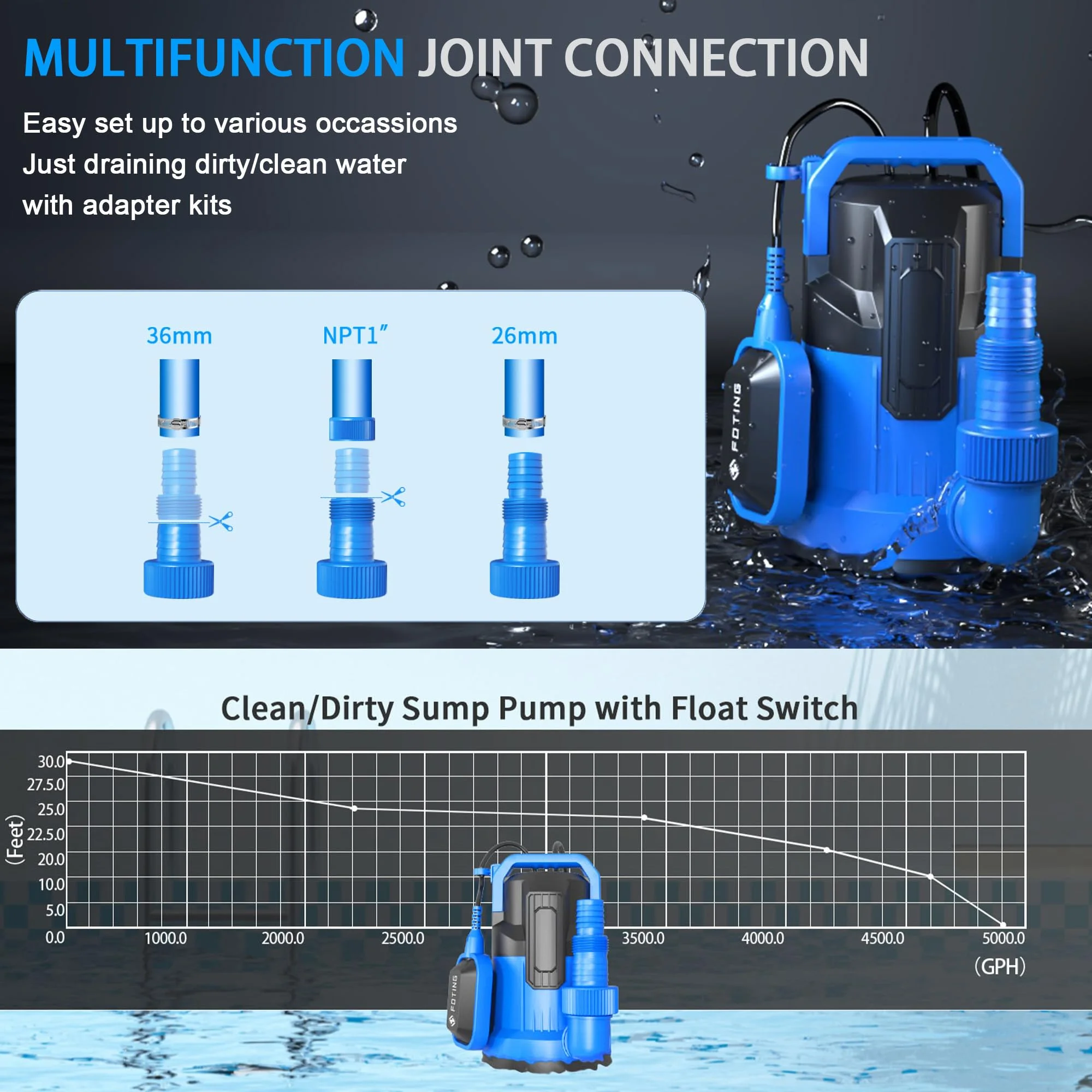 4900 GPH Submersible Pump – 1/2 HP motor lifts water up to 29 ft and removes down to 0.04″ quickly. Float Switch – Automatic on/off by water level; manual mode for continuous use. Unplug if running dry. Overload Protection – Corrosion-resistant thermoplastic with IPX8 waterproofing and thermal overload safety. Portable & Compact – Ergonomic handle, lightweight, low-noise, ideal for home or outdoor use. Versatile Use – 1-1/2″ NPT discharge with adapters for 36mm, 26mm, or 1″ hoses; perfect for pools, basements, or ponds. Warranty – Includes three-year after-sale service for peace of mind.
