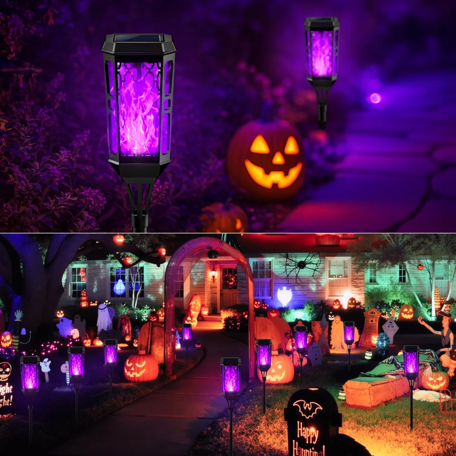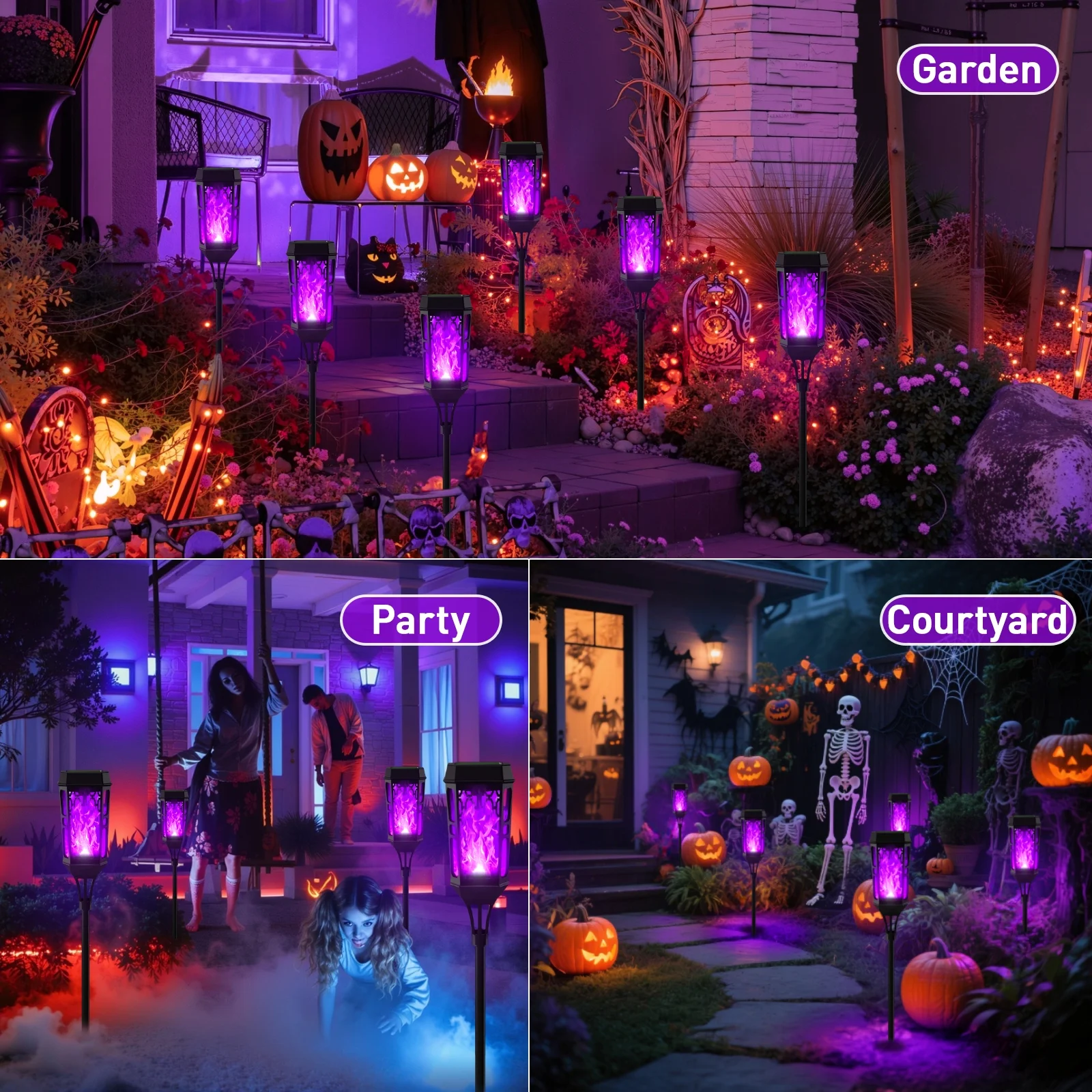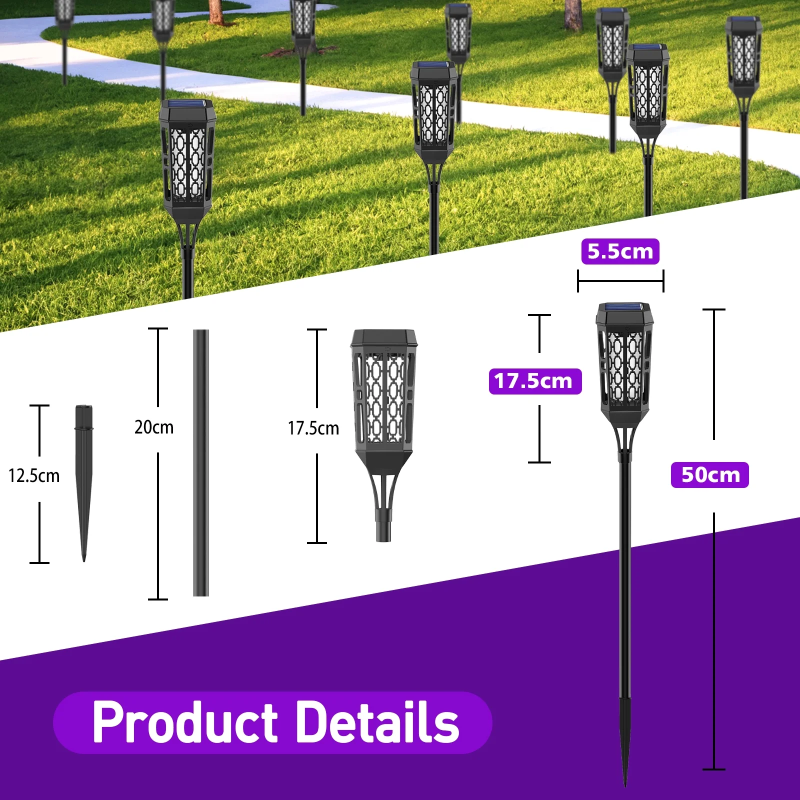 Illuminate your outdoor space with this LED Solar Torch Light, featuring a captivating purple illumination and a flickering flame effect. It is an excellent decorative landscape with a vivid and strong flickering flame for outdoor events and can be decorated in many places in any season: camps, gardens, lawns, sidewalks, terraces, courtyards, parks, etc. Bright LEDs will light up automatically at night. These solar garden lights are equipped with high-efficiency solar panels and large-capacity lithium batteries. It works for 8-12 hours after being fully charged and lights up the whole night. The solar lights automatically switch on/off from dusk to dawn and are IP65 waterproof, making them durable in all weather conditions. With easy installation and versatile usage, they are perfect for gardens, patios, lawns, yards, pathways, and festive occasions. (Luces solares para patio. Solar flickering flame lights. Solar yard lights. Halloween decoration lights)