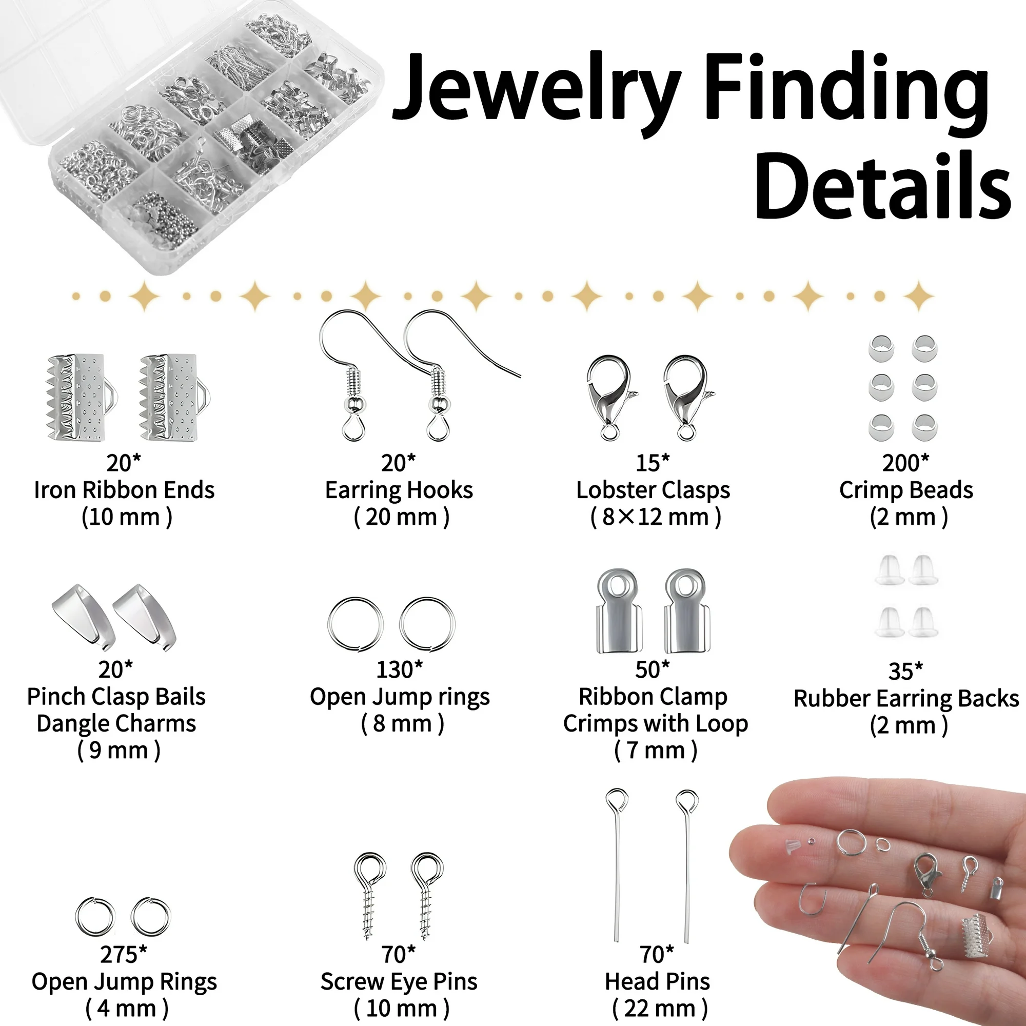 [VARIOUS JEWELRY FINDINGS] Includes 11 essential components: ribbon ends, earring hooks, lobster clasps, pinch bails, ribbon clamp crimps, jump rings (2 sizes), crimp beads, screw eye pins, head pins, and rubber earring backs — perfect for creating or repairing earrings, necklaces, and more.